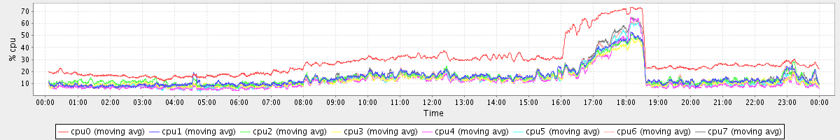 avg(cpu0) = 1.45 avg(cpu1) = 0.27 avg(cpu2) = 0.32 avg(cpu3) = 0.20 avg(cpu4) = 0.16 avg(cpu5) = 0.17 avg(cpu6) = 0.24 avg(cpu7) = 0.16