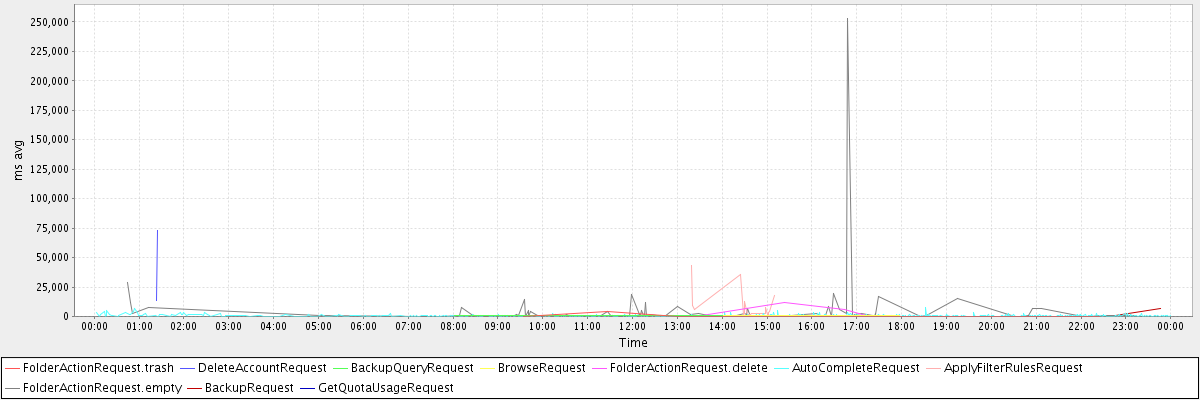 avg(FolderActionRequest.trash) = 768.83 avg(DeleteAccountRequest) = 43206.00 avg(BackupQueryRequest) = 812.25 avg(BrowseRequest) = 824.50 avg(FolderActionRequest.delete) = 4276.25 avg(AutoCompleteRequest) = 654.08 avg(ApplyFilterRulesRequest) = 8755.06 avg(FolderActionRequest.empty) = 5042.33 avg(BackupRequest) = 3956.50 avg(GetQuotaUsageRequest) = 1219.00