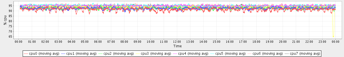 avg(cpu0) = 91.31 avg(cpu1) = 92.46 avg(cpu2) = 92.54 avg(cpu3) = 93.20 avg(cpu4) = 94.76 avg(cpu5) = 95.05 avg(cpu6) = 95.03 avg(cpu7) = 94.59