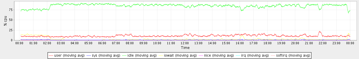 avg(user) = 10.76 avg(sys) = 0.93 avg(idle) = 85.14 avg(iowait) = 2.92 avg(nice) = 0.00 avg(irq) = 0.01 avg(softirq) = 0.24