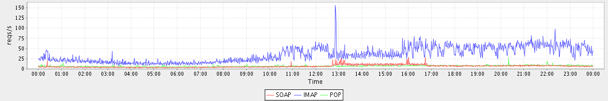 Host zm03.stanford.edu: Mailboxd: Request Rate by Client Protocol