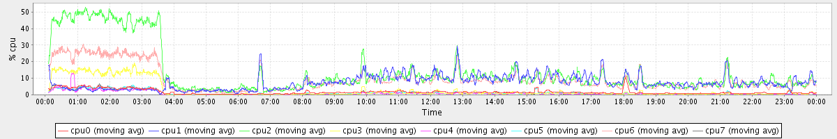 avg(cpu0) = 1.68 avg(cpu1) = 7.40 avg(cpu2) = 13.73 avg(cpu3) = 2.70 avg(cpu4) = 0.90 avg(cpu5) = 1.13 avg(cpu6) = 9.34 avg(cpu7) = 1.01
