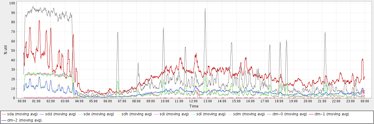 avg(sda) = 0.31 avg(sdd) = 6.06 avg(sde) = 6.74 avg(sdh) = 6.26 avg(sdi) = 6.84 avg(sdl) = 6.03 avg(sdm) = 6.67 avg(dm-0) = 24.87 avg(dm-1) = 23.67 avg(dm-2) = 0.00