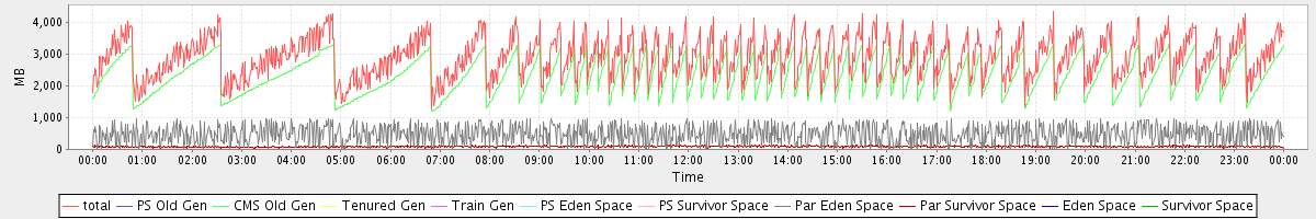 avg(total) = 2913.00 avg(PS Old Gen) = 0.00 avg(CMS Old Gen) = 2340.67 avg(Tenured Gen) = 0.00 avg(Train Gen) = 0.00 avg(PS Eden Space) = 0.00 avg(PS Survivor Space) = 0.00 avg(Par Eden Space) = 484.11 avg(Par Survivor Space) = 88.22 avg(Eden Space) = 0.00 avg(Survivor Space) = 0.00