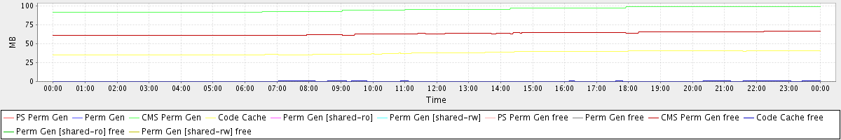 avg(PS Perm Gen) = 0.00 avg(Perm Gen) = 0.00 avg(CMS Perm Gen) = 95.15 avg(Code Cache) = 37.80 avg(Perm Gen [shared-ro]) = 0.00 avg(Perm Gen [shared-rw]) = 0.00 avg(PS Perm Gen free) = 0.00 avg(Perm Gen free) = 0.00 avg(CMS Perm Gen free) = 63.34 avg(Code Cache free) = 0.36 avg(Perm Gen [shared-ro] free) = 0.00 avg(Perm Gen [shared-rw] free) = 0.00