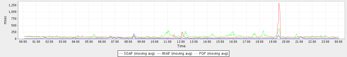 avg(ModifyAppointmentRequest) = 681.99 avg(GetContactsRequest) = 676.47 avg(FolderActionRequest.delete) = 2587.56 avg(SendInviteReplyRequest) = 530.07 avg(AutoCompleteRequest) = 871.02 avg(ApplyFilterRulesRequest) = 637.33 avg(ConvActionRequest.delete) = 659.07 avg(FolderActionRequest.empty) = 3595.92 avg(BackupRequest) = 9887.00 avg(GetQuotaUsageRequest) = 1270.00