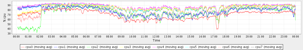 avg(cpu0) = 70.15 avg(cpu1) = 77.80 avg(cpu2) = 73.65 avg(cpu3) = 85.02 avg(cpu4) = 88.14 avg(cpu5) = 86.04 avg(cpu6) = 77.96 avg(cpu7) = 85.67