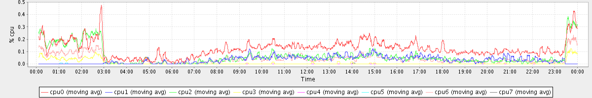avg(cpu0) = 1.34 avg(cpu1) = 0.32 avg(cpu2) = 0.36 avg(cpu3) = 0.24 avg(cpu4) = 0.18 avg(cpu5) = 0.21 avg(cpu6) = 0.29 avg(cpu7) = 0.21