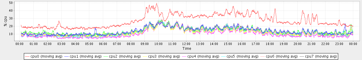 avg(cpu0) = 27.07 avg(cpu1) = 13.80 avg(cpu2) = 13.91 avg(cpu3) = 12.06 avg(cpu4) = 10.15 avg(cpu5) = 12.12 avg(cpu6) = 12.76 avg(cpu7) = 12.83