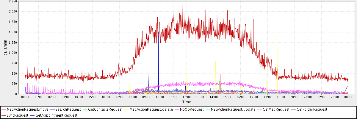 max(MsgActionRequest.move) = 474.00 max(SearchRequest) = 163.00 max(GetContactsRequest) = 309.00 max(MsgActionRequest.delete) = 1555.00 max(NoOpRequest) = 321.00 max(MsgActionRequest.update) = 140.00 max(GetMsgRequest) = 122.00 max(GetFolderRequest) = 165.00 max(SyncRequest) = 2143.00 max(GetAppointmentRequest) = 1512.00