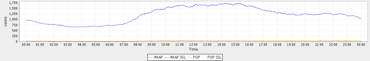 avg(IMAP) = 26.14 avg(IMAP SSL) = 1203.03 avg(POP) = 0.30 avg(POP SSL) = 31.83