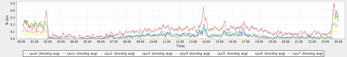 avg(cpu0) = 1.25 avg(cpu1) = 0.29 avg(cpu2) = 0.34 avg(cpu3) = 0.20 avg(cpu4) = 0.15 avg(cpu5) = 0.18 avg(cpu6) = 0.25 avg(cpu7) = 0.19