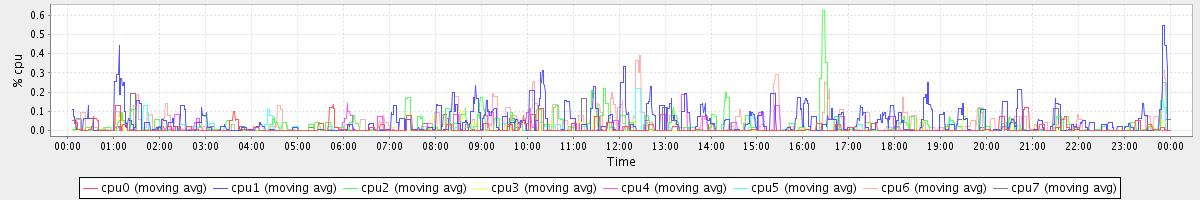 avg(cpu0) = 1.07 avg(cpu1) = 0.77 avg(cpu2) = 0.71 avg(cpu3) = 0.63 avg(cpu4) = 0.45 avg(cpu5) = 0.38 avg(cpu6) = 0.42 avg(cpu7) = 0.41
