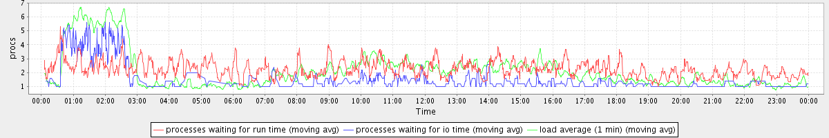 avg(processes waiting for run time) = 1.44 avg(processes waiting for io time) = 0.72 avg(load average (1 min)) = 2.11