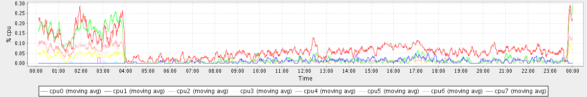 avg(cpu0) = 0.07 avg(cpu1) = 0.01 avg(cpu2) = 0.04 avg(cpu3) = 0.01 avg(cpu4) = 0.00 avg(cpu5) = 0.00 avg(cpu6) = 0.02 avg(cpu7) = 0.00
