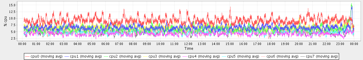avg(cpu0) = 9.21 avg(cpu1) = 6.52 avg(cpu2) = 6.14 avg(cpu3) = 6.62 avg(cpu4) = 4.36 avg(cpu5) = 4.97 avg(cpu6) = 5.10 avg(cpu7) = 4.89