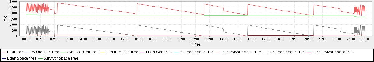 avg(total free) = 2344.22 avg(PS Old Gen free) = 0.00 avg(CMS Old Gen free) = 1796.53 avg(Tenured Gen free) = 0.00 avg(Train Gen free) = 0.00 avg(PS Eden Space free) = 0.00 avg(PS Survivor Space free) = 0.00 avg(Par Eden Space free) = 489.08 avg(Par Survivor Space free) = 58.61 avg(Eden Space free) = 0.00 avg(Survivor Space free) = 0.00