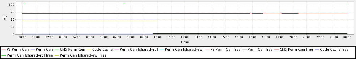 avg(PS Perm Gen) = 0.00 avg(Perm Gen) = 0.00 avg(CMS Perm Gen) = 106.68 avg(Code Cache) = 45.38 avg(Perm Gen [shared-ro]) = 0.00 avg(Perm Gen [shared-rw]) = 0.00 avg(PS Perm Gen free) = 0.00 avg(Perm Gen free) = 0.00 avg(CMS Perm Gen free) = 71.25 avg(Code Cache free) = 2.62 avg(Perm Gen [shared-ro] free) = 0.00 avg(Perm Gen [shared-rw] free) = 0.00