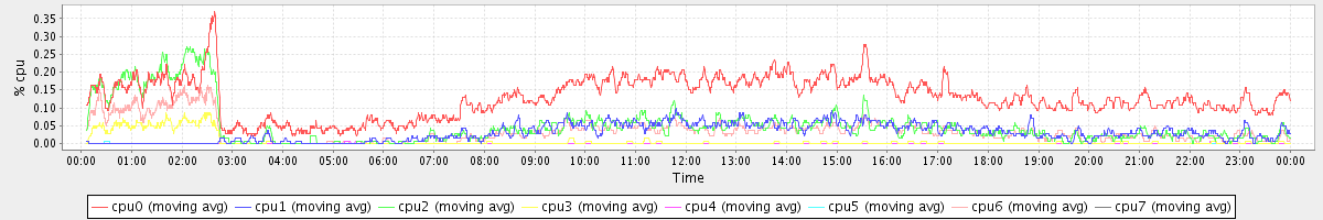 avg(cpu0) = 1.28 avg(cpu1) = 0.26 avg(cpu2) = 0.32 avg(cpu3) = 0.21 avg(cpu4) = 0.14 avg(cpu5) = 0.18 avg(cpu6) = 0.24 avg(cpu7) = 0.14