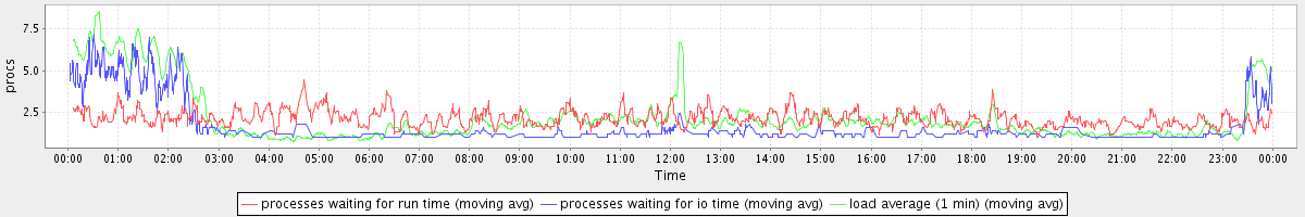 avg(processes waiting for run time) = 1.33 avg(processes waiting for io time) = 0.85 avg(load average (1 min)) = 2.19