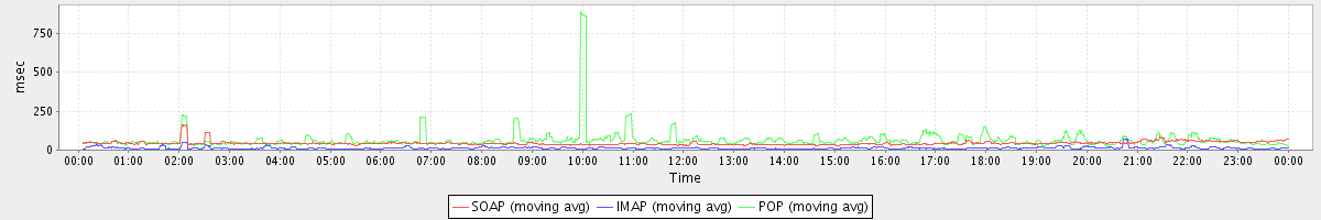 avg(GetContactsRequest) = 1075.81 avg(BackupQueryRequest) = 669.00 avg(GetFreeBusyRequest) = 641.97 avg(SendInviteReplyRequest) = 709.09 avg(RemoveAttachmentsRequest) = 559.50 avg(AutoCompleteRequest) = 590.96 avg(ApplyFilterRulesRequest) = 7767.00 avg(FolderActionRequest.empty) = 3943.47 avg(BackupRequest) = 5171.00 avg(GetQuotaUsageRequest) = 2474.00