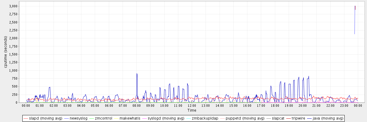 avg(slapd) = 116.42 avg(newsyslog) = 2712.33 avg(zmcontrol) = 4.75 avg(makewhatis) = 87.50 avg(syslogd) = 9.63 avg(zmbackupldap) = 5.00 avg(puppetd) = 15.71 avg(slapcat) = 281.00 avg(tripwire) = 2948.50 avg(java) = 132.30