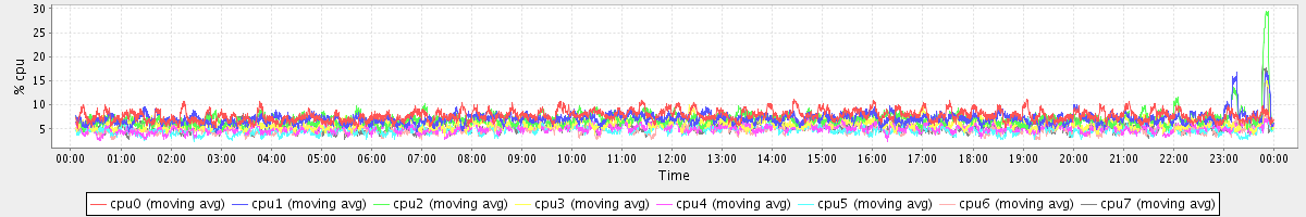 avg(cpu0) = 7.79 avg(cpu1) = 7.16 avg(cpu2) = 7.10 avg(cpu3) = 6.13 avg(cpu4) = 5.15 avg(cpu5) = 4.89 avg(cpu6) = 5.01 avg(cpu7) = 5.43