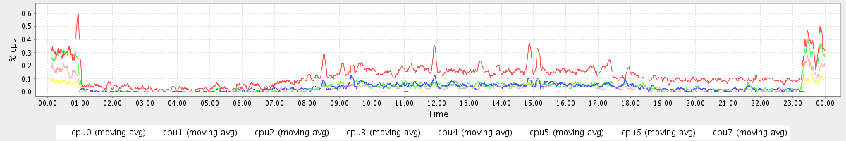 avg(cpu0) = 1.14 avg(cpu1) = 0.24 avg(cpu2) = 0.27 avg(cpu3) = 0.17 avg(cpu4) = 0.17 avg(cpu5) = 0.16 avg(cpu6) = 0.20 avg(cpu7) = 0.16