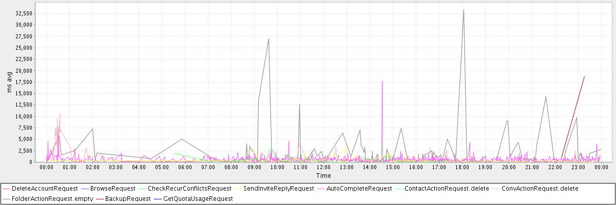 avg(DeleteAccountRequest) = 5237.00 avg(BrowseRequest) = 1253.00 avg(CheckRecurConflictsRequest) = 540.76 avg(SendInviteReplyRequest) = 510.90 avg(AutoCompleteRequest) = 608.89 avg(ContactActionRequest.delete) = 1096.00 avg(ConvActionRequest.delete) = 1063.79 avg(FolderActionRequest.empty) = 2447.89 avg(BackupRequest) = 9844.00 avg(GetQuotaUsageRequest) = 2371.00