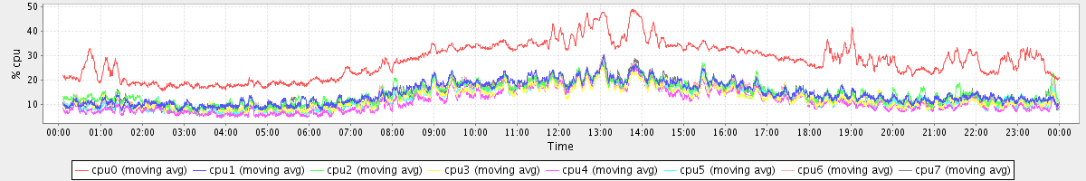 avg(cpu0) = 27.81 avg(cpu1) = 14.50 avg(cpu2) = 14.51 avg(cpu3) = 12.46 avg(cpu4) = 11.21 avg(cpu5) = 12.43 avg(cpu6) = 13.41 avg(cpu7) = 13.50