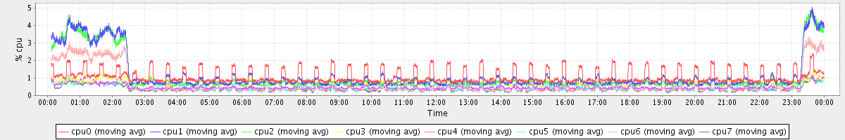 avg(cpu0) = 0.65 avg(cpu1) = 4.35 avg(cpu2) = 4.42 avg(cpu3) = 0.62 avg(cpu4) = 0.86 avg(cpu5) = 0.74 avg(cpu6) = 3.07 avg(cpu7) = 0.66
