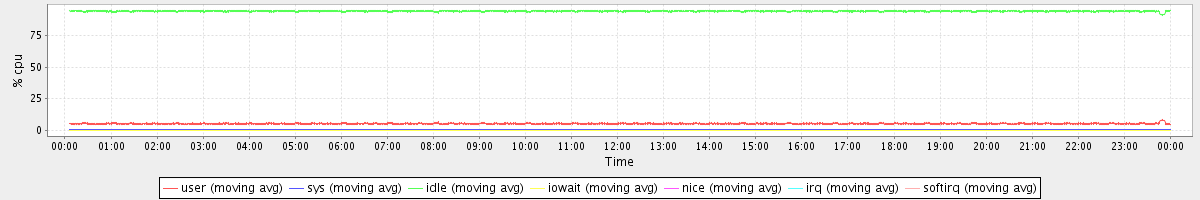 avg(user) = 5.31 avg(sys) = 0.46 avg(idle) = 94.18 avg(iowait) = 0.02 avg(nice) = 0.00 avg(irq) = 0.00 avg(softirq) = 0.00