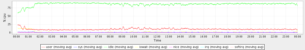 avg(user) = 10.29 avg(sys) = 0.94 avg(idle) = 86.58 avg(iowait) = 1.93 avg(nice) = 0.00 avg(irq) = 0.01 avg(softirq) = 0.25