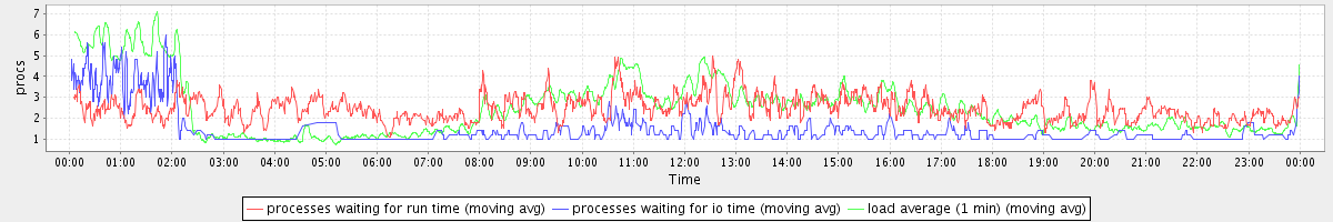 avg(processes waiting for run time) = 1.83 avg(processes waiting for io time) = 0.69 avg(load average (1 min)) = 2.47
