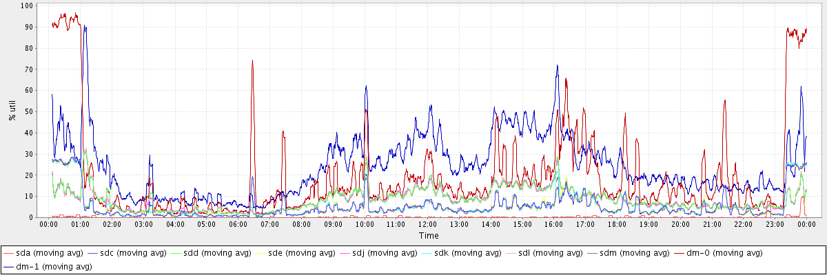 avg(sda) = 0.28 avg(sdc) = 5.51 avg(sdd) = 8.42 avg(sde) = 5.48 avg(sdj) = 8.38 avg(sdk) = 5.51 avg(sdl) = 8.43 avg(sdm) = 5.50 avg(dm-0) = 19.98 avg(dm-1) = 24.17