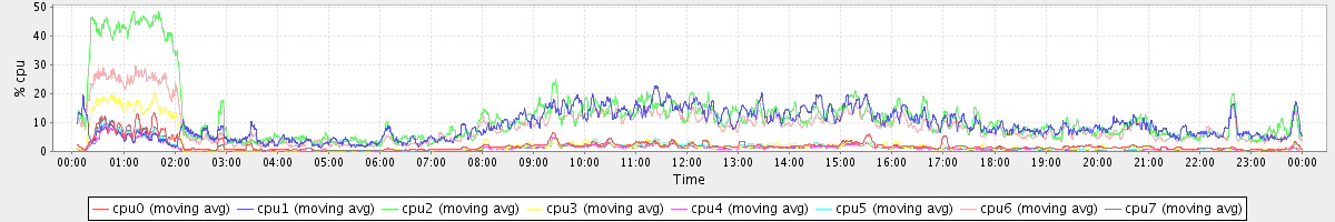 avg(cpu0) = 1.81 avg(cpu1) = 0.33 avg(cpu2) = 0.39 avg(cpu3) = 0.27 avg(cpu4) = 0.20 avg(cpu5) = 0.28 avg(cpu6) = 0.30 avg(cpu7) = 0.27