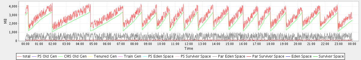 avg(total) = 2800.03 avg(PS Old Gen) = 0.00 avg(CMS Old Gen) = 2222.33 avg(Tenured Gen) = 0.00 avg(Train Gen) = 0.00 avg(PS Eden Space) = 0.00 avg(PS Survivor Space) = 0.00 avg(Par Eden Space) = 490.05 avg(Par Survivor Space) = 87.65 avg(Eden Space) = 0.00 avg(Survivor Space) = 0.00