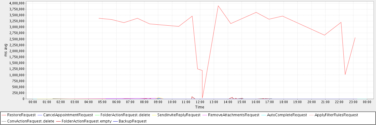avg(RestoreRequest) = 2618158.80 avg(CancelAppointmentRequest) = 670.74 avg(FolderActionRequest.delete) = 1799.80 avg(SendInviteReplyRequest) = 1501.32 avg(RemoveAttachmentsRequest) = 2526.21 avg(AutoCompleteRequest) = 717.78 avg(ApplyFilterRulesRequest) = 1422.00 avg(ConvActionRequest.delete) = 1097.25 avg(FolderActionRequest.empty) = 4534.83 avg(BackupRequest) = 9466.00