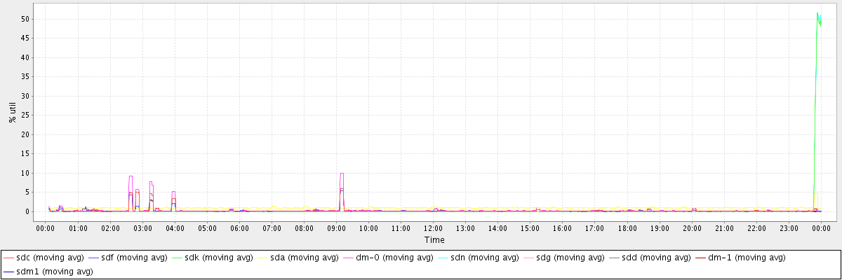avg(sdc) = 0.23 avg(sdf) = 0.19 avg(sdk) = 0.49 avg(sda) = 1.00 avg(dm-0) = 0.41 avg(sdn) = 0.49 avg(sdg) = 0.01 avg(sdd) = 0.02 avg(dm-1) = 0.02 avg(sdm1) = 0.00