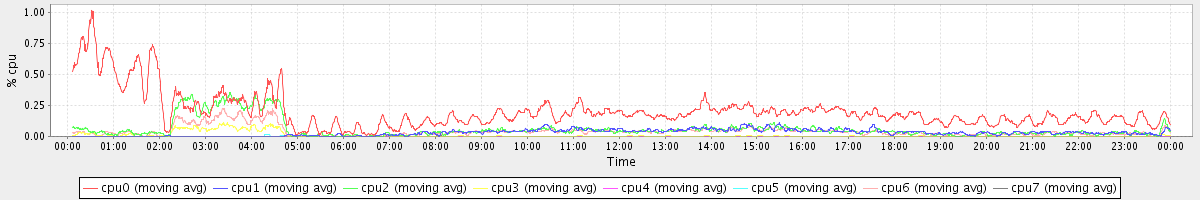 avg(cpu0) = 2.47 avg(cpu1) = 0.26 avg(cpu2) = 0.28 avg(cpu3) = 0.19 avg(cpu4) = 0.14 avg(cpu5) = 0.15 avg(cpu6) = 0.22 avg(cpu7) = 0.15