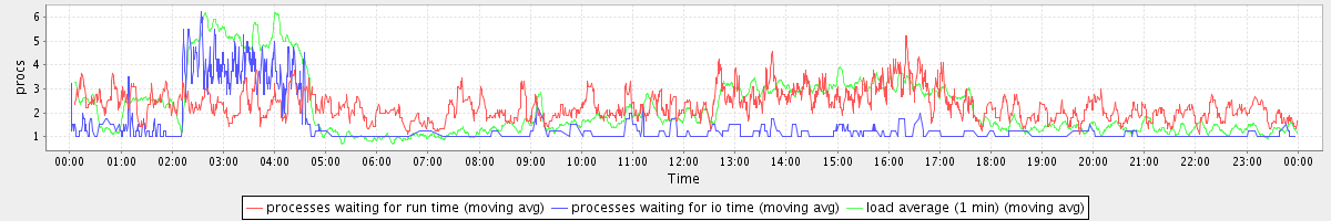 avg(processes waiting for run time) = 1.63 avg(processes waiting for io time) = 0.64 avg(load average (1 min)) = 2.20