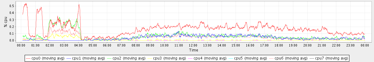 avg(cpu0) = 0.17 avg(cpu1) = 0.04 avg(cpu2) = 0.06 avg(cpu3) = 0.01 avg(cpu4) = 0.00 avg(cpu5) = 0.00 avg(cpu6) = 0.04 avg(cpu7) = 0.00