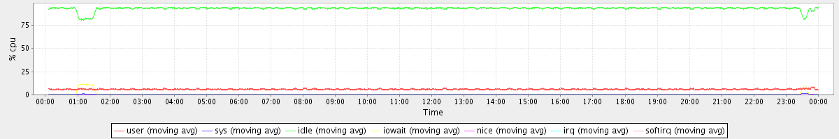 avg(user) = 5.88 avg(sys) = 0.61 avg(idle) = 93.13 avg(iowait) = 0.36 avg(nice) = 0.00 avg(irq) = 0.00 avg(softirq) = 0.00