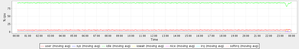 avg(user) = 5.87 avg(sys) = 0.60 avg(idle) = 93.40 avg(iowait) = 0.11 avg(nice) = 0.00 avg(irq) = 0.00 avg(softirq) = 0.00