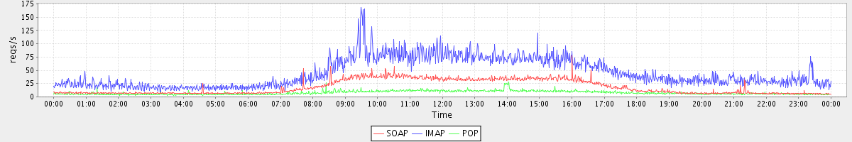 Host zm07.stanford.edu: Mailboxd: Request Rate by Client Protocol