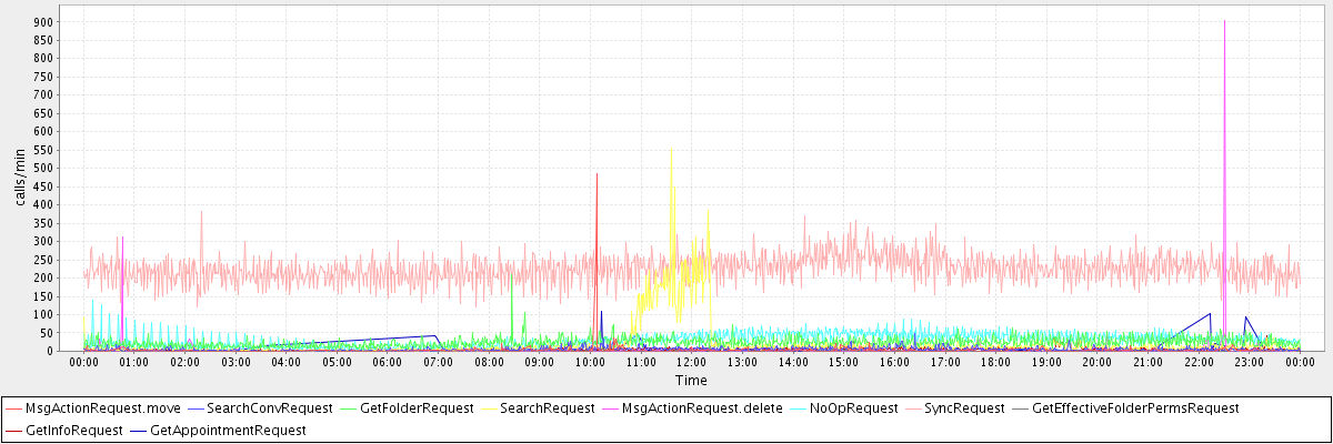 max(MsgActionRequest.move) = 484.00 max(SearchConvRequest) = 48.00 max(GetFolderRequest) = 210.00 max(SearchRequest) = 556.00 max(MsgActionRequest.delete) = 903.00 max(NoOpRequest) = 141.00 max(SyncRequest) = 381.00 max(GetEffectiveFolderPermsRequest) = 33.00 max(GetInfoRequest) = 41.00 max(GetAppointmentRequest) = 109.00