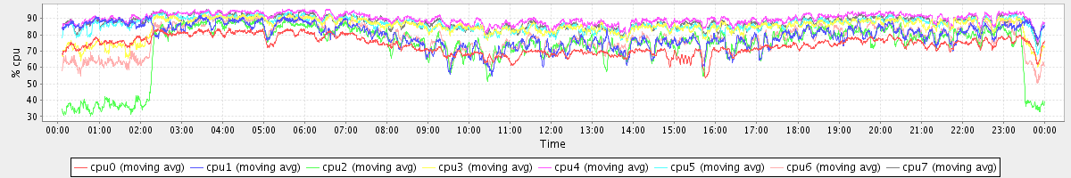 avg(cpu0) = 73.65 avg(cpu1) = 79.66 avg(cpu2) = 73.11 avg(cpu3) = 84.65 avg(cpu4) = 89.83 avg(cpu5) = 86.66 avg(cpu6) = 77.94 avg(cpu7) = 87.59