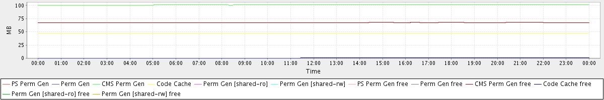 avg(PS Perm Gen) = 0.00 avg(Perm Gen) = 0.00 avg(CMS Perm Gen) = 101.13 avg(Code Cache) = 47.38 avg(Perm Gen [shared-ro]) = 0.00 avg(Perm Gen [shared-rw]) = 0.00 avg(PS Perm Gen free) = 0.00 avg(Perm Gen free) = 0.00 avg(CMS Perm Gen free) = 67.49 avg(Code Cache free) = 0.56 avg(Perm Gen [shared-ro] free) = 0.00 avg(Perm Gen [shared-rw] free) = 0.00