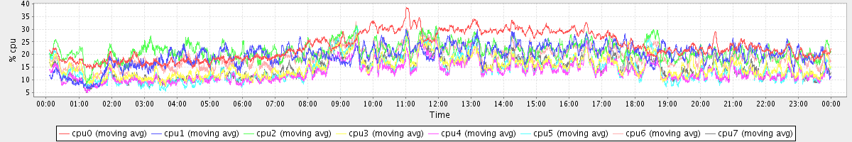 avg(cpu0) = 3.93 avg(cpu1) = 15.51 avg(cpu2) = 21.30 avg(cpu3) = 5.34 avg(cpu4) = 2.73 avg(cpu5) = 3.71 avg(cpu6) = 16.64 avg(cpu7) = 3.37