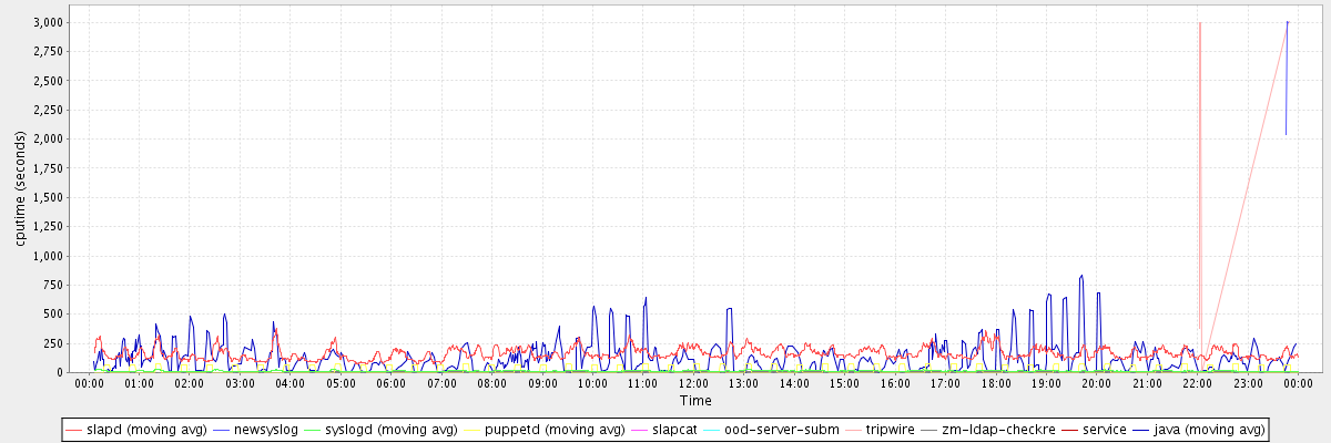 avg(slapd) = 162.80 avg(newsyslog) = 2809.60 avg(syslogd) = 14.01 avg(puppetd) = 16.19 avg(slapcat) = 198.00 avg(ood-server-subm) = 6.00 avg(tripwire) = 1654.33 avg(zm-ldap-checkre) = 5.08 avg(service) = 5.00 avg(java) = 129.09